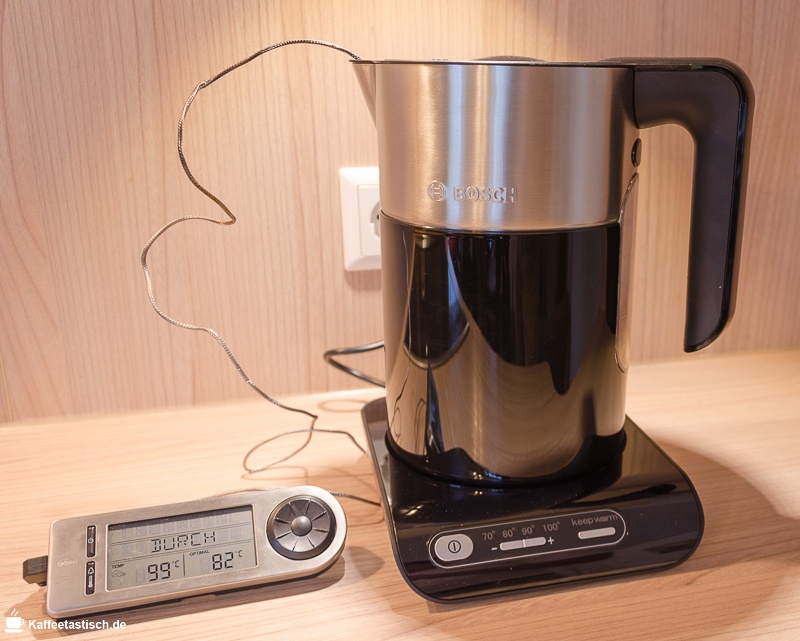 Im Bild unten ist zu sehen, dass der Bosch Wasserkocher nach Beendigung des Erhitzen auch tatsächlich ca. 100° C erreicht hat.